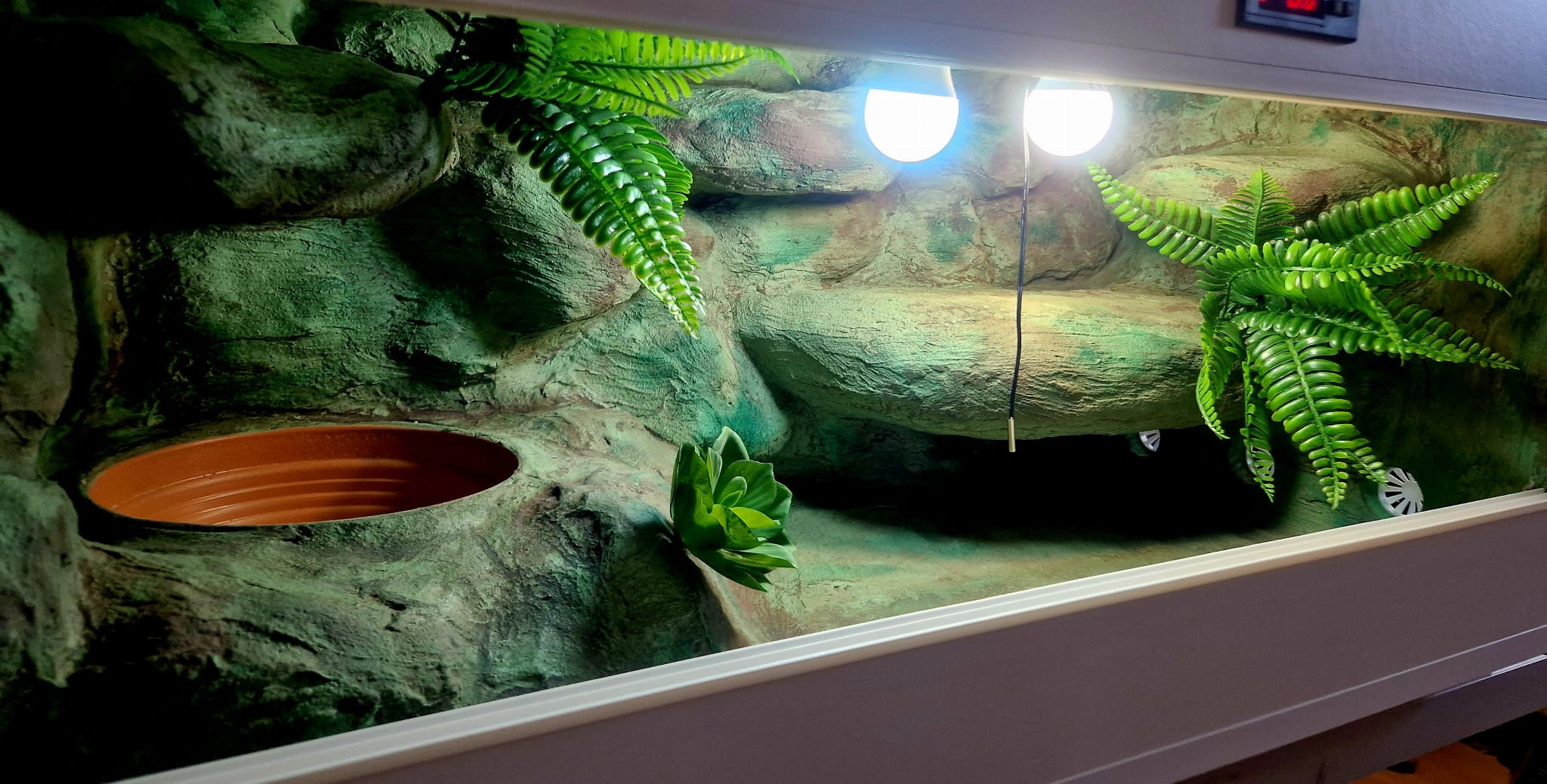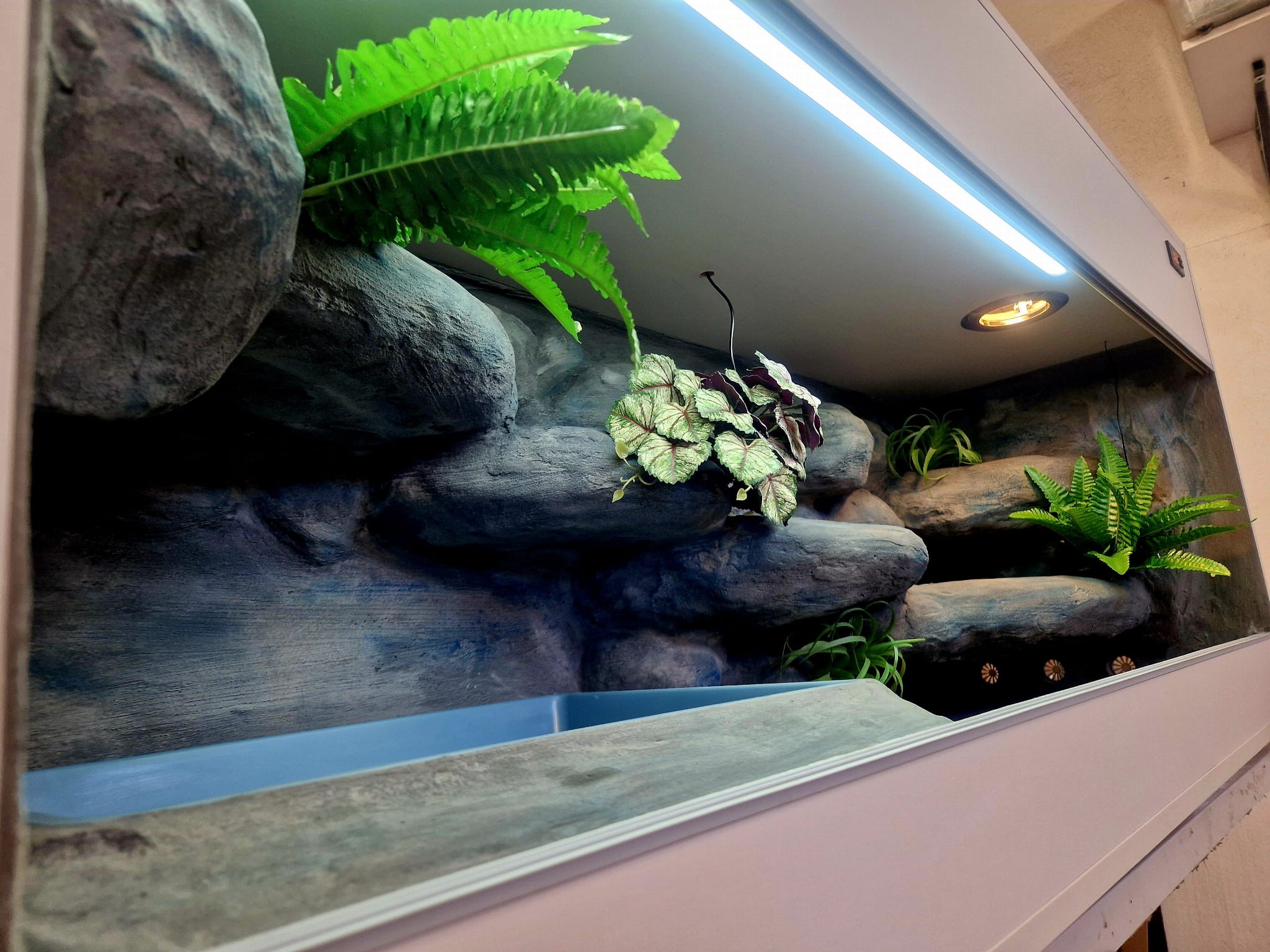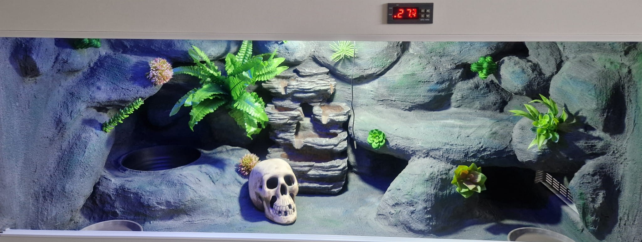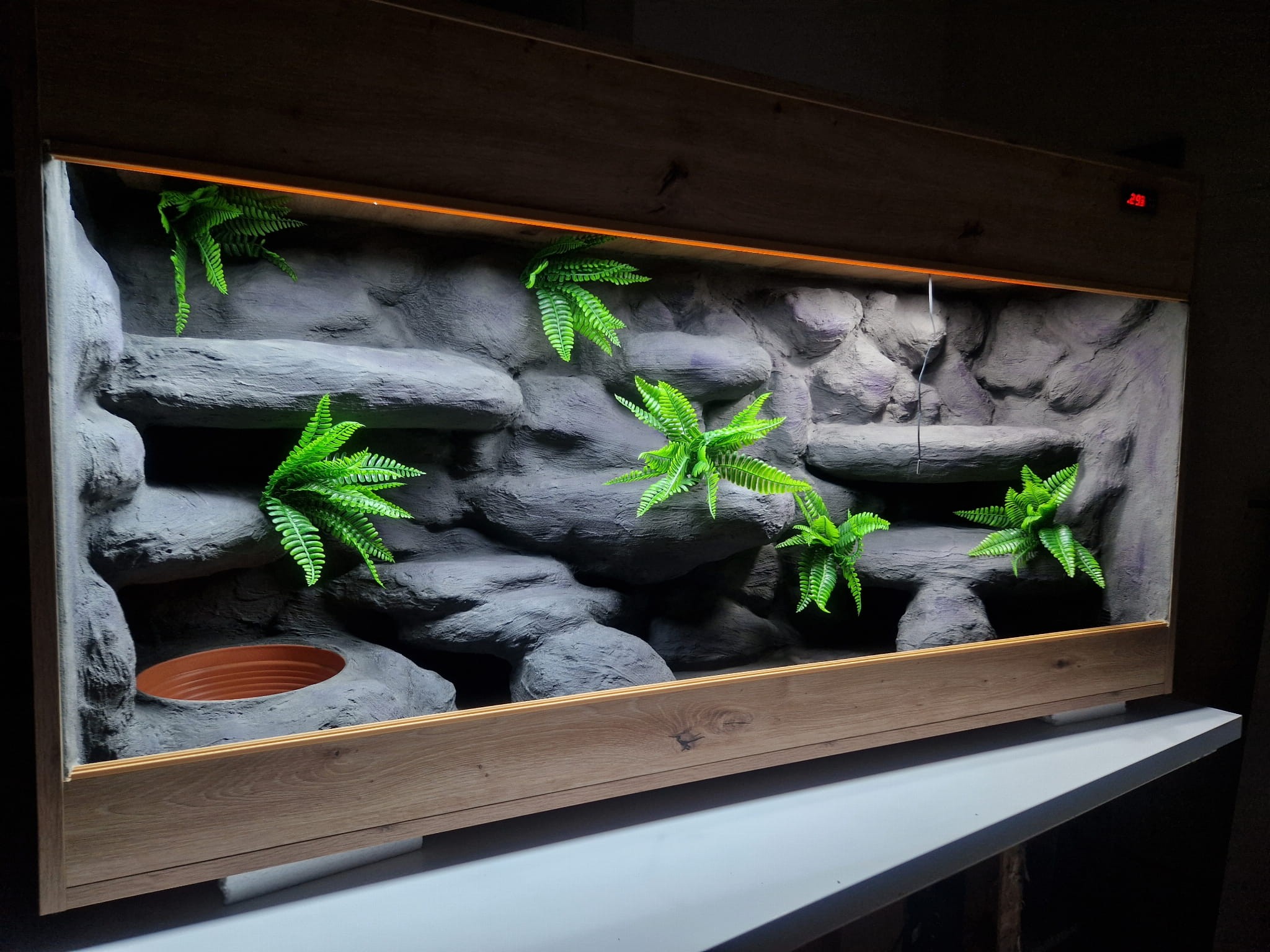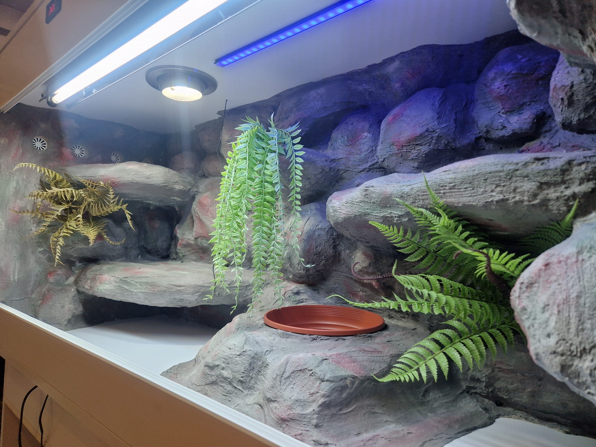Zdjęcia przedstawiają wykonane przez nas terraria na indywidualne zamówienie i mogą być wzorem do kolejnych prac. Terraria zamówione przez Państwa nie będą więc kopią jak te przedstawione poniżej - mogą być jednak podobne. Każdy zbiornik budujemy od podstaw. Kupujący ma możliwość wyboru układu skał (w miarę możliwości) oraz koloru tła terrarium.