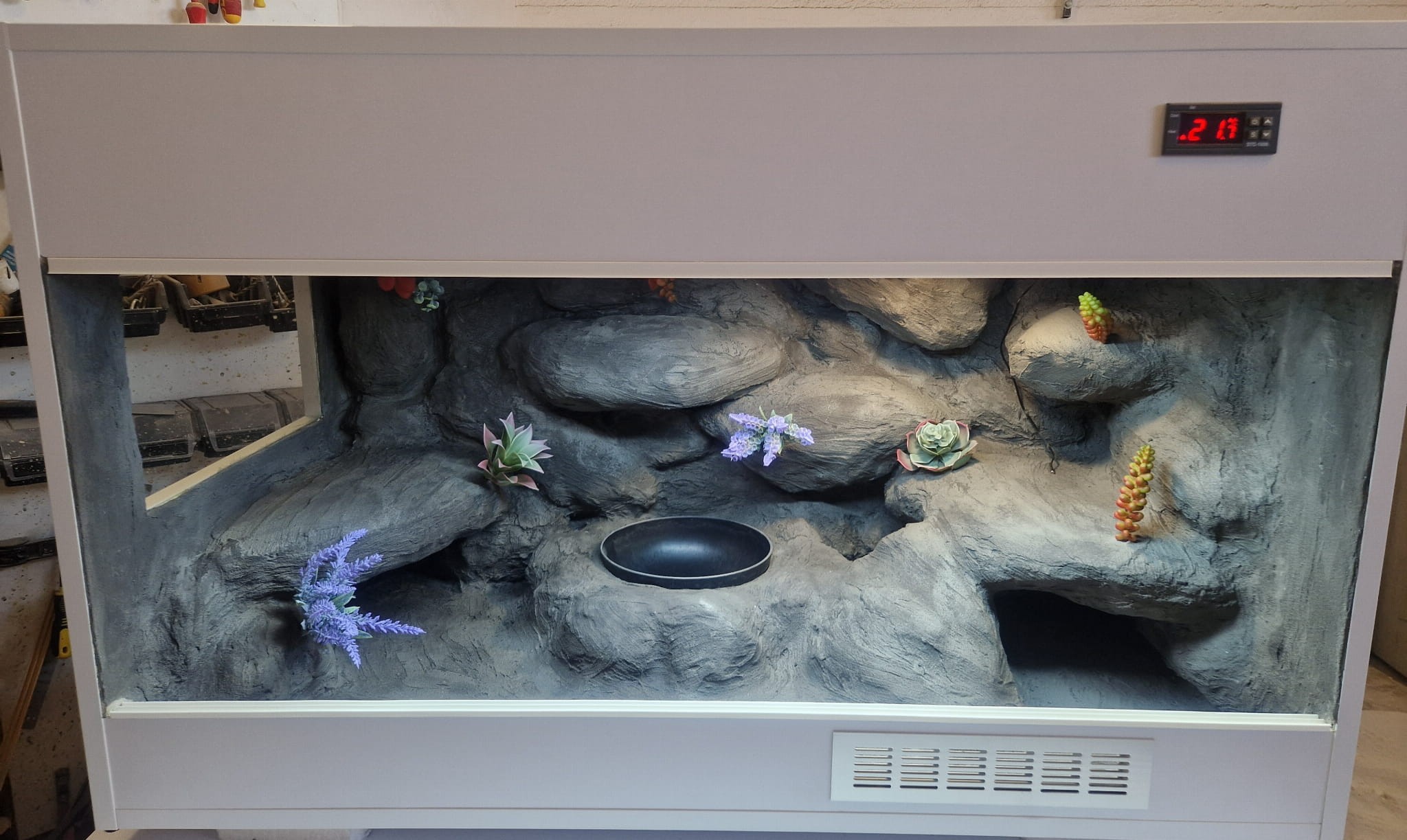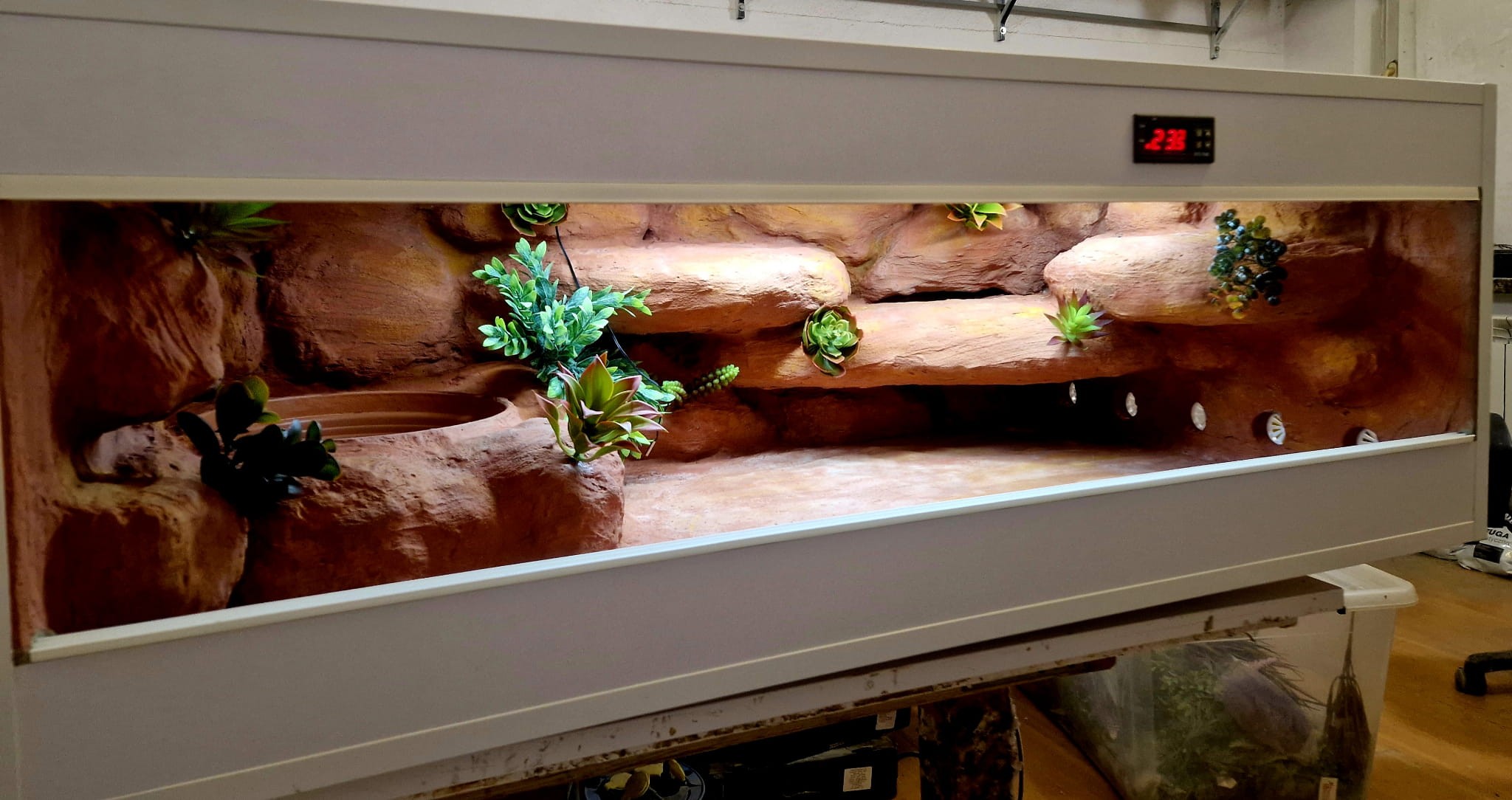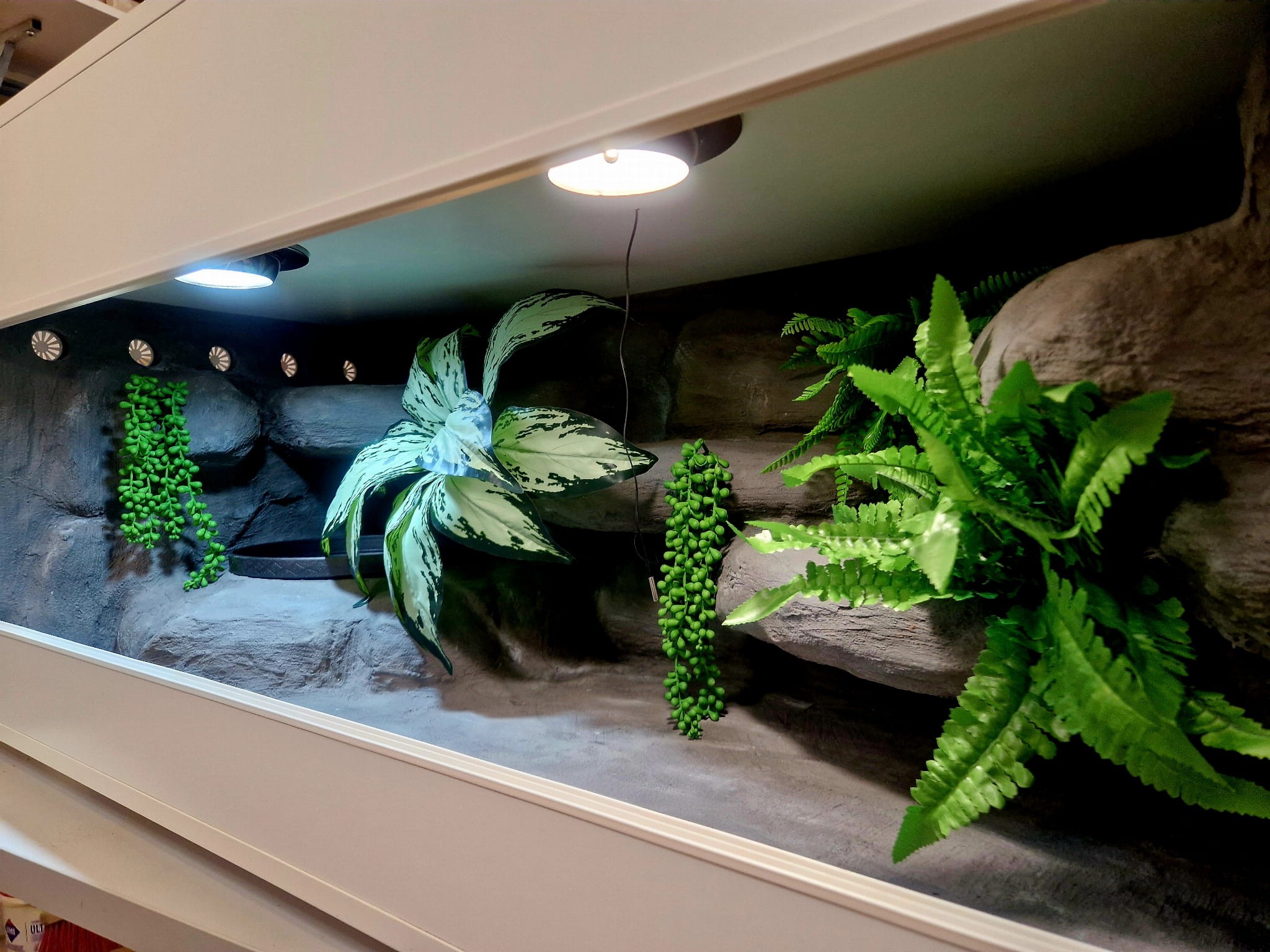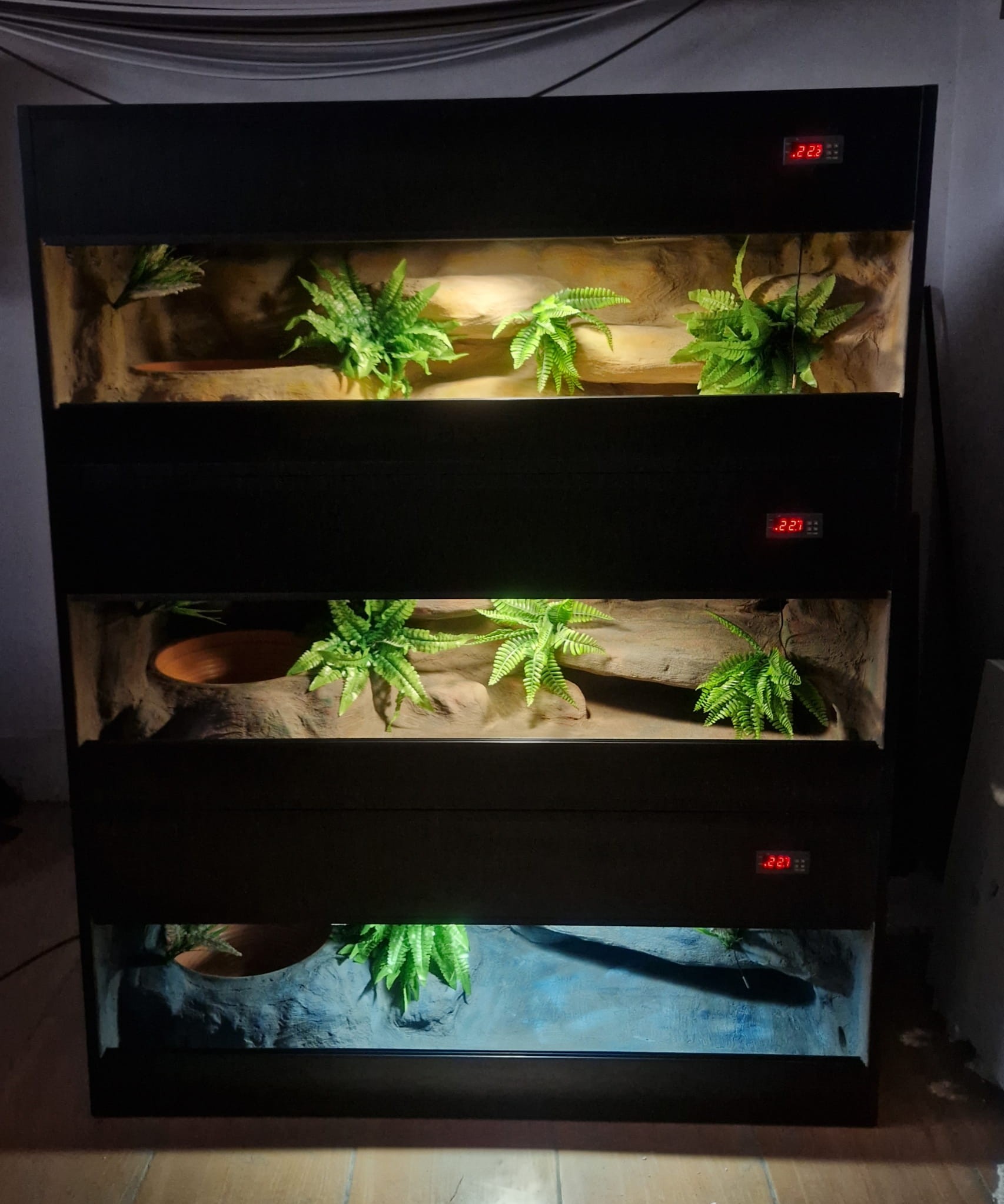 Korzenie, sterowniki, włączniki, żarówki, czaszki, higrometry widoczne na niektórych przykładowych zdjęciach nie wchodzą w skład podstawowego wyposażenia terrarium. Jest jednak możliwość doposażenia zbiornika za dopłatą.