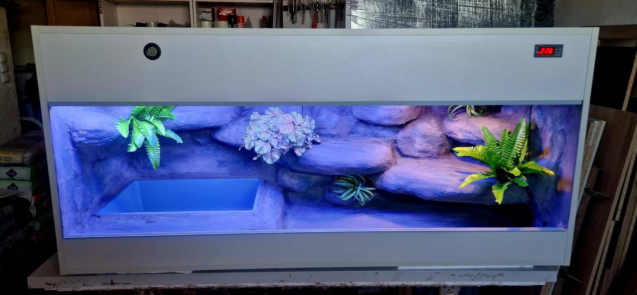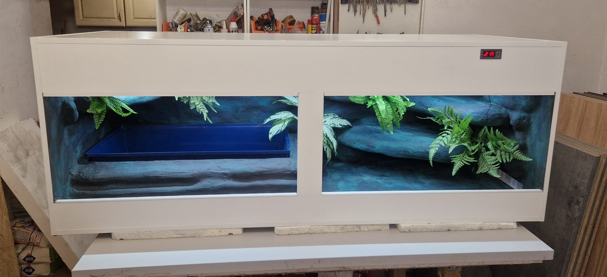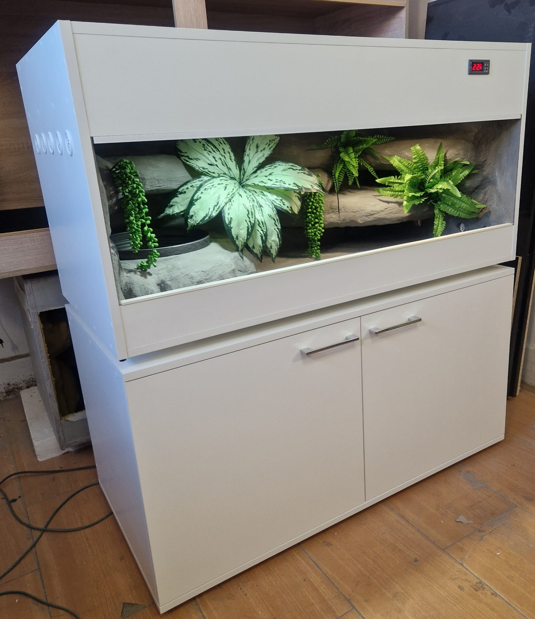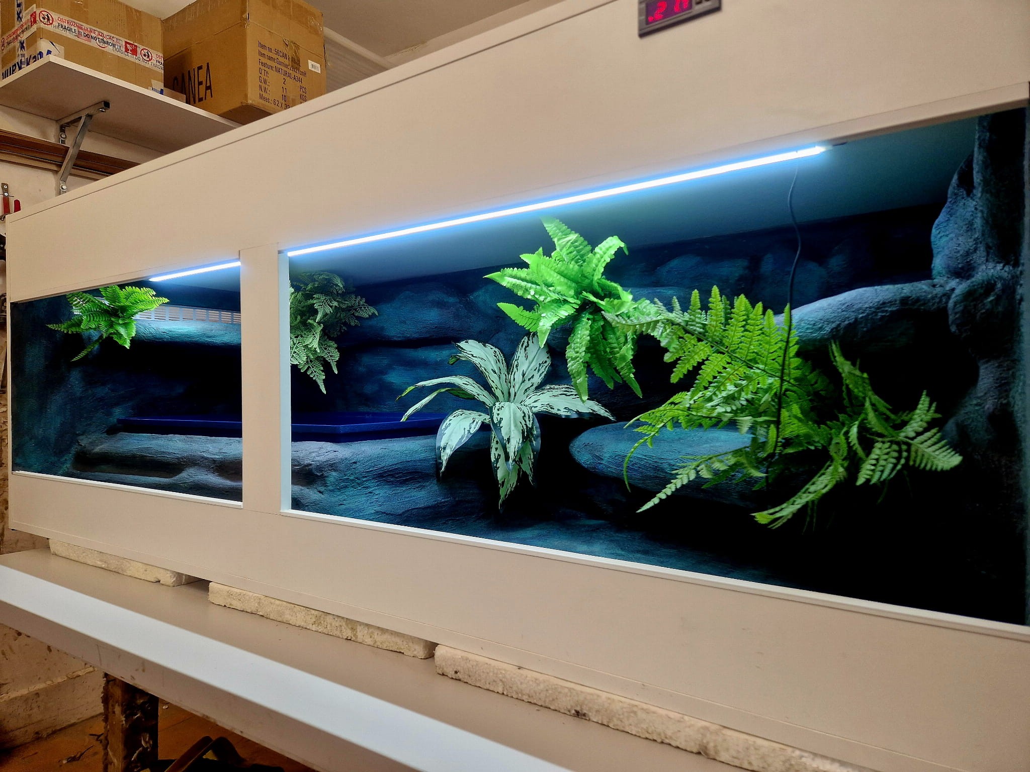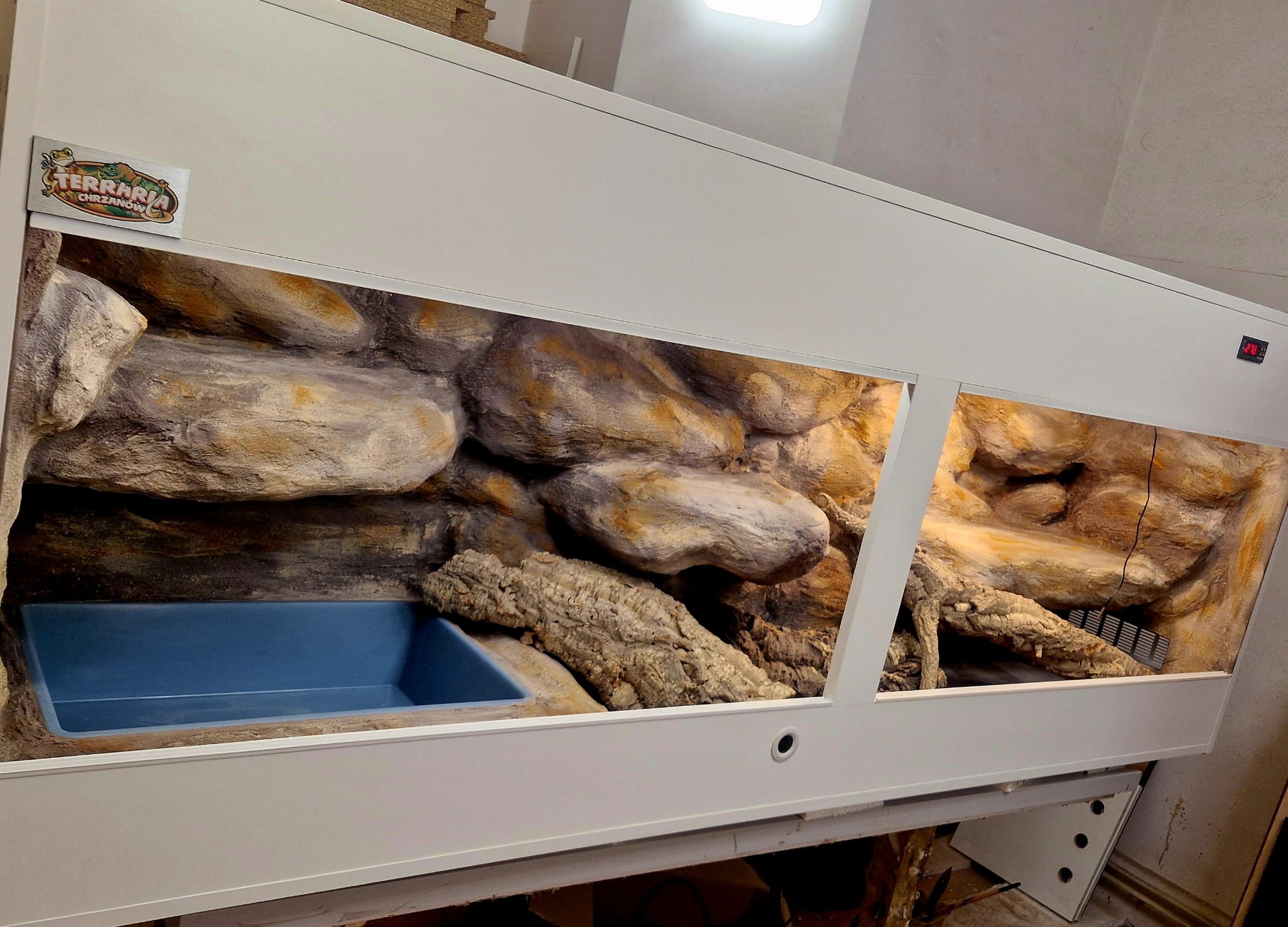 - sufit podwieszany, który zabiera nam 12 cm przestrzeni od góry zbiornika - dzięki niemu mamy maksymalnie ukrytą elektrykę co jest najbardziej bezpieczną opcją dla węży