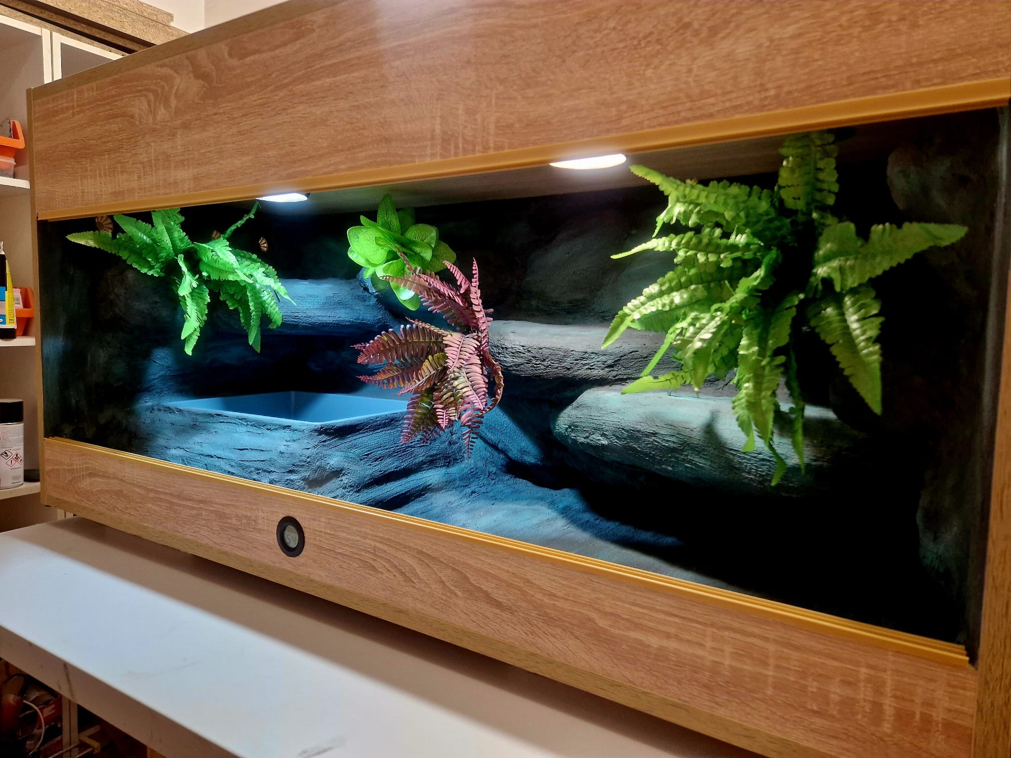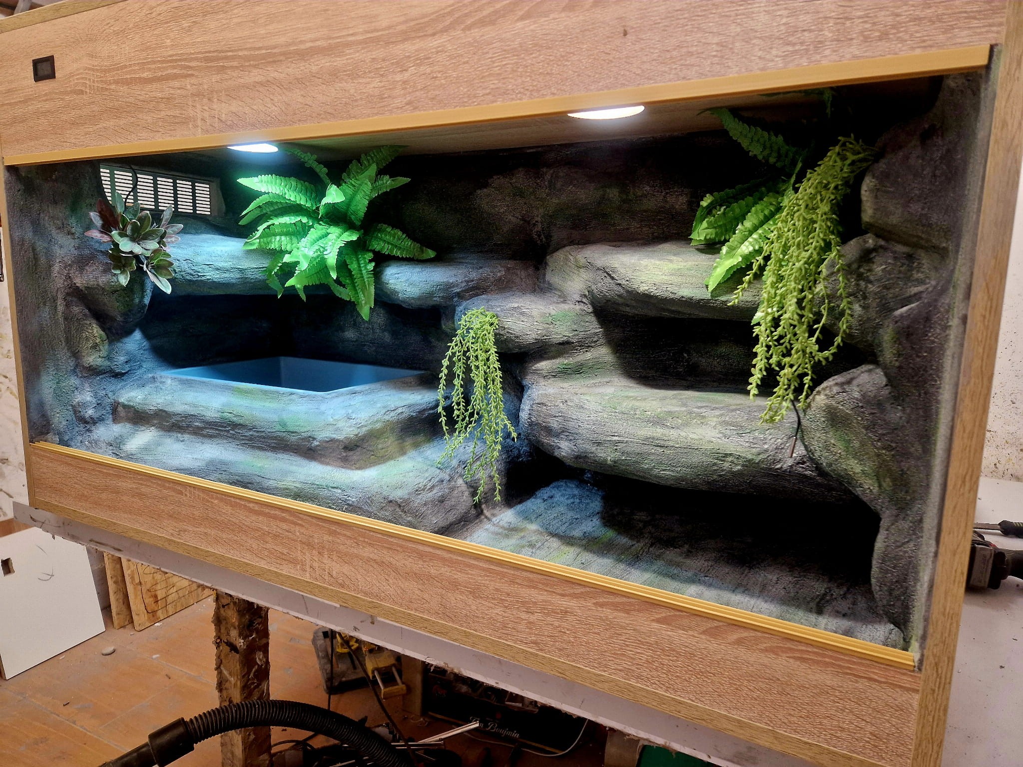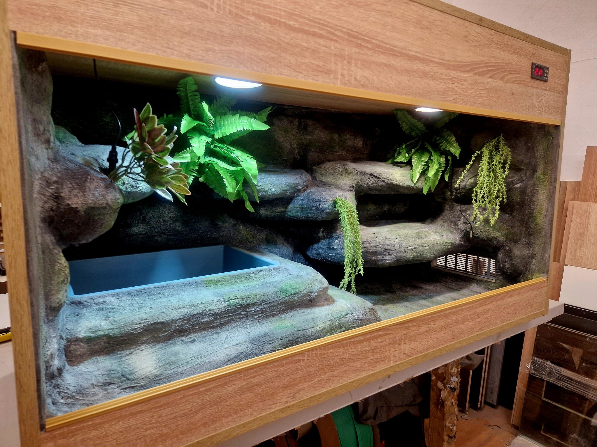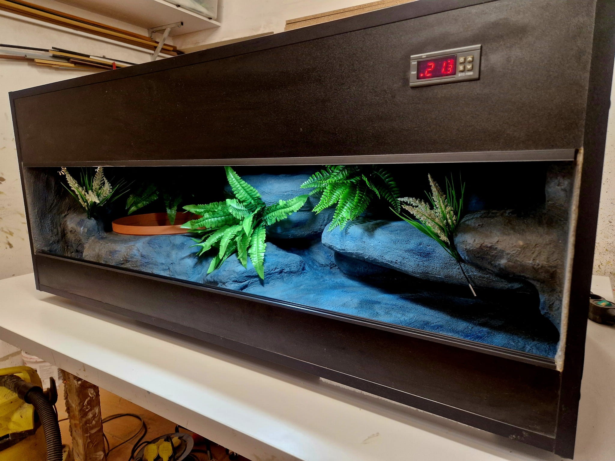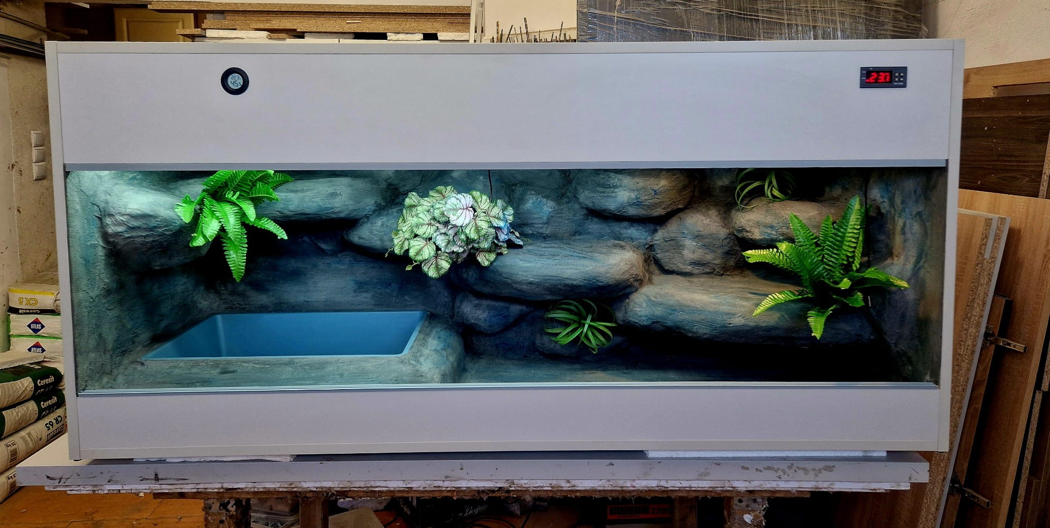 - sufit podwieszany, który zabiera nam 12 cm przestrzeni od góry zbiornika - dzięki niemu mamy maksymalnie ukrytą elektrykę co jest najbardziej bezpieczną opcją dla węży
