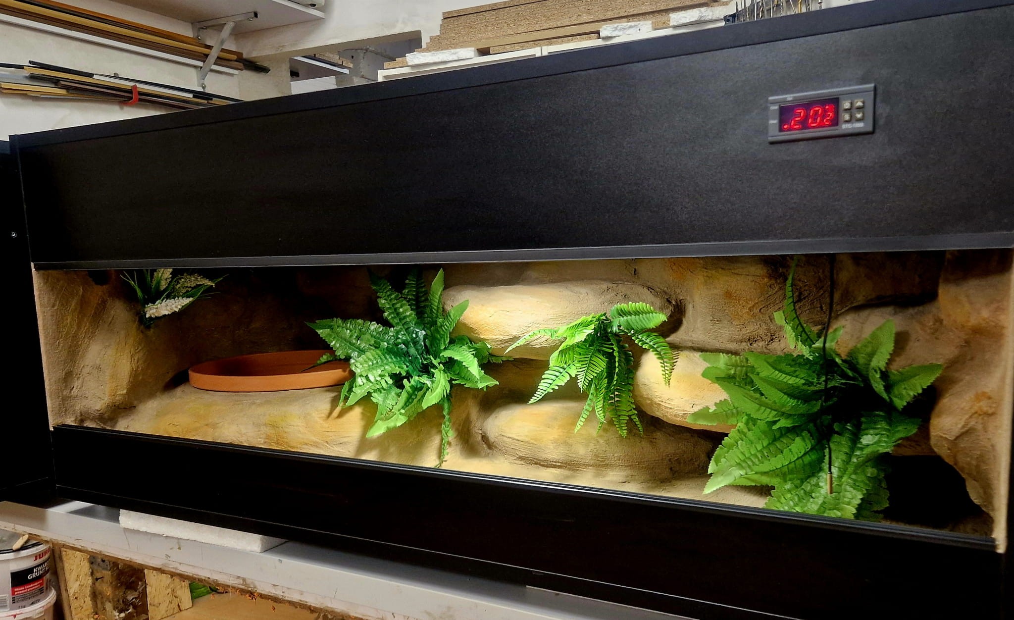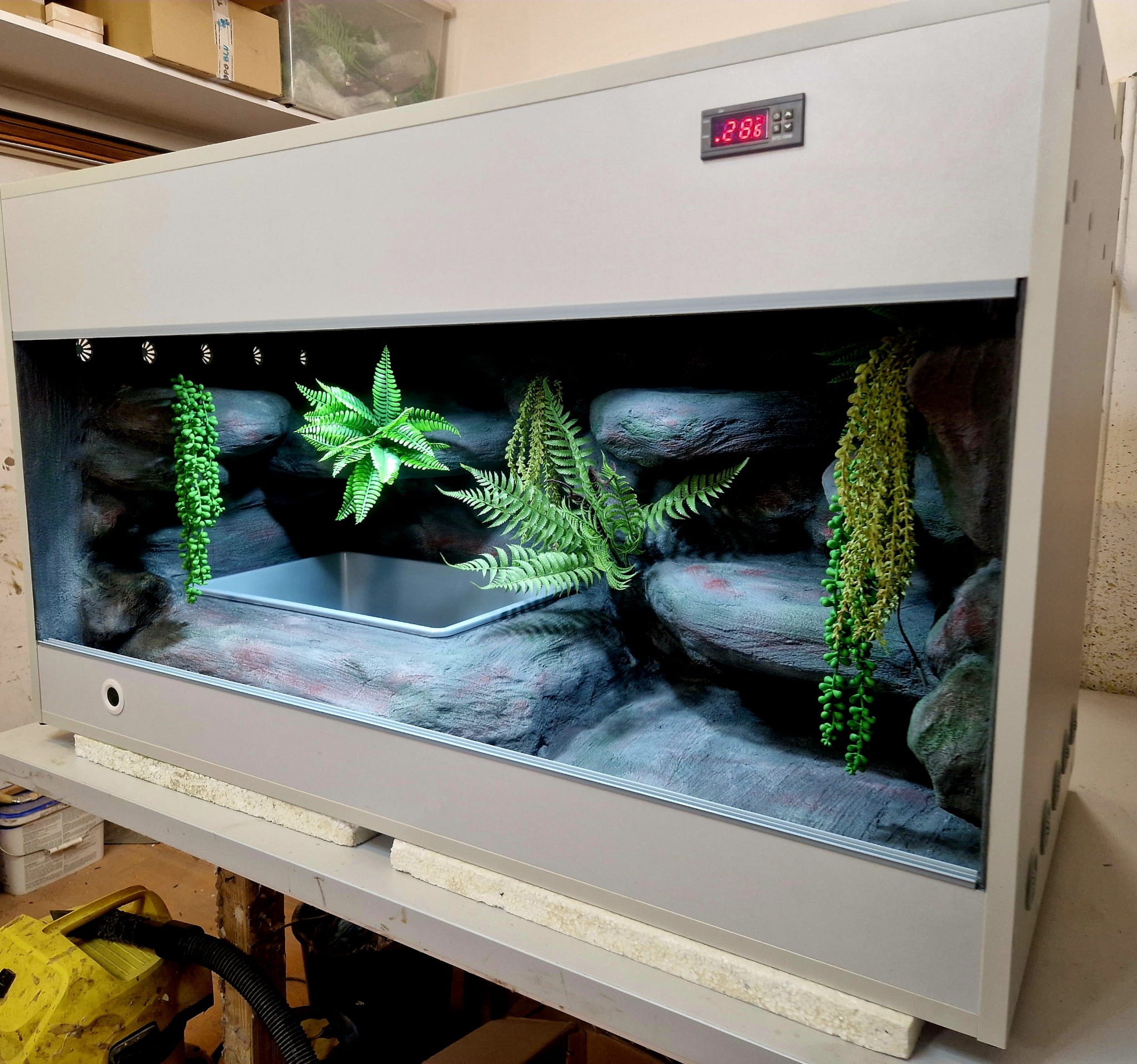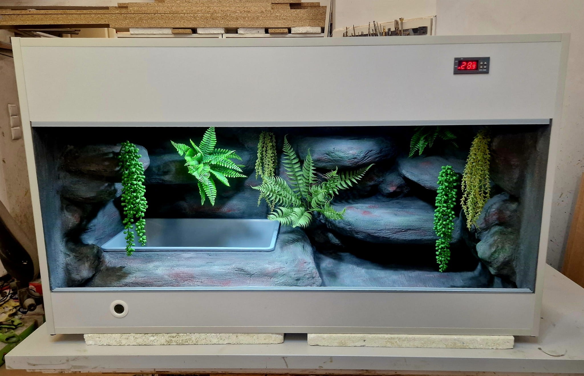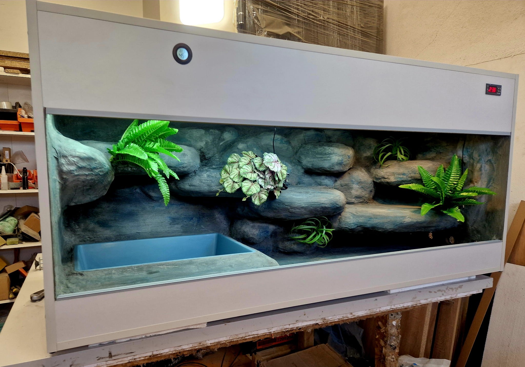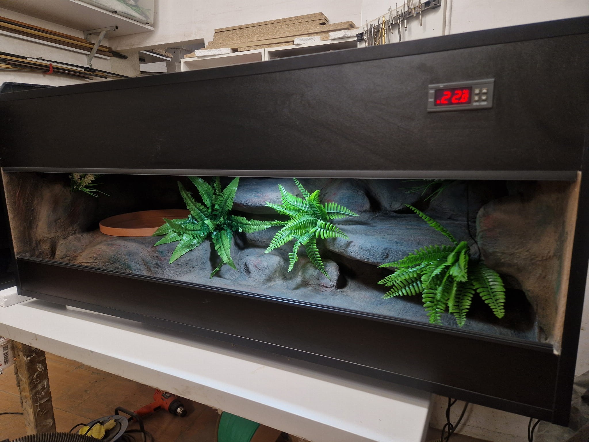 - sufit podwieszany, który zabiera nam 12 cm przestrzeni od góry zbiornika - dzięki niemu mamy maksymalnie ukrytą elektrykę co jest najbardziej bezpieczną opcją dla węży
