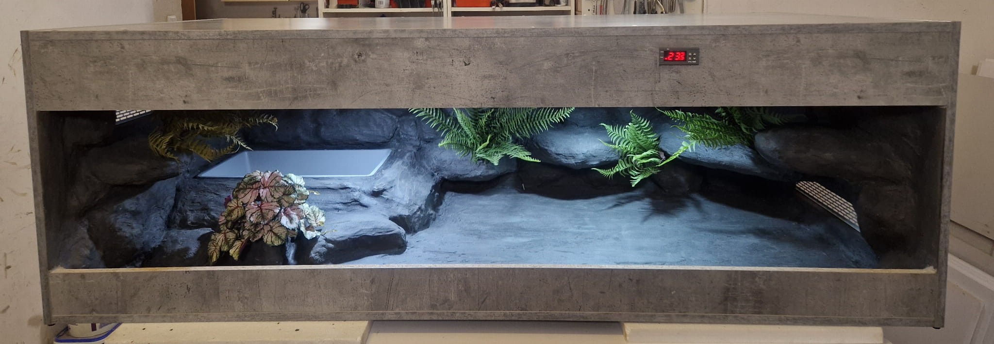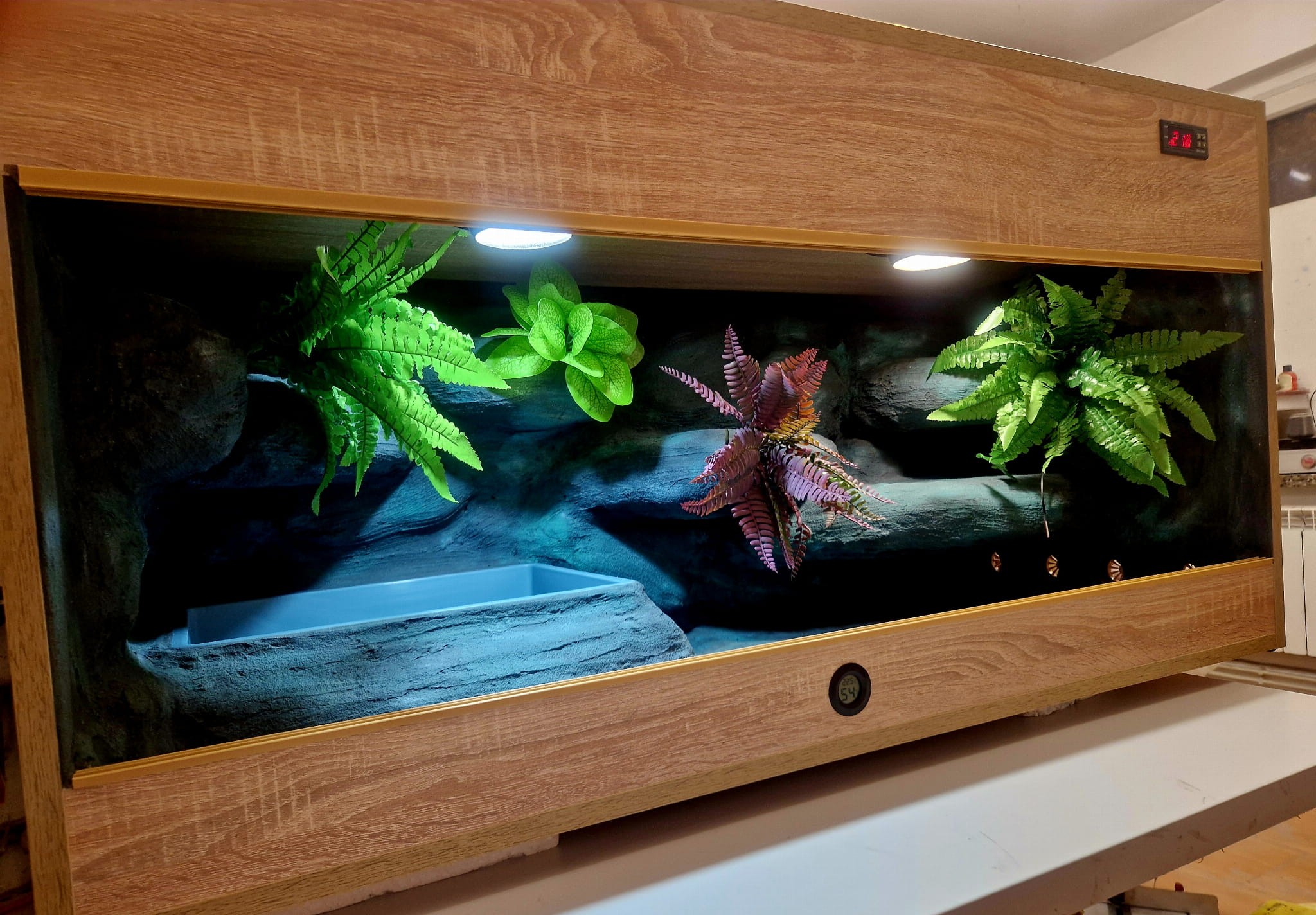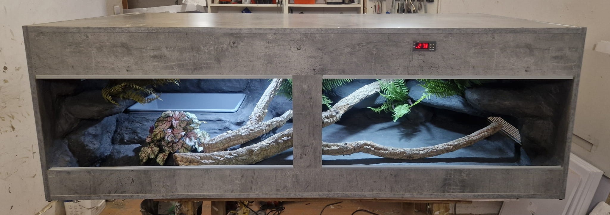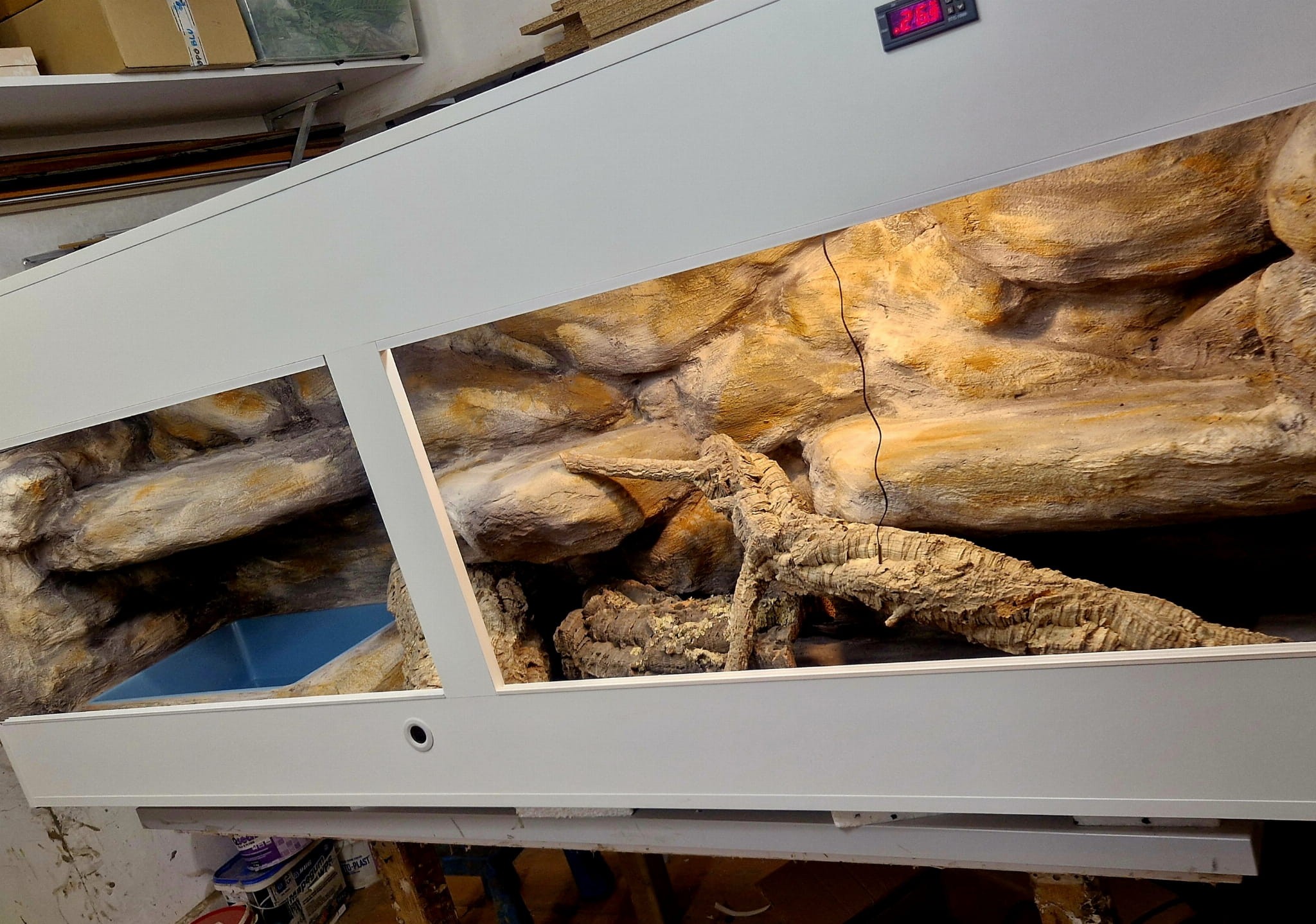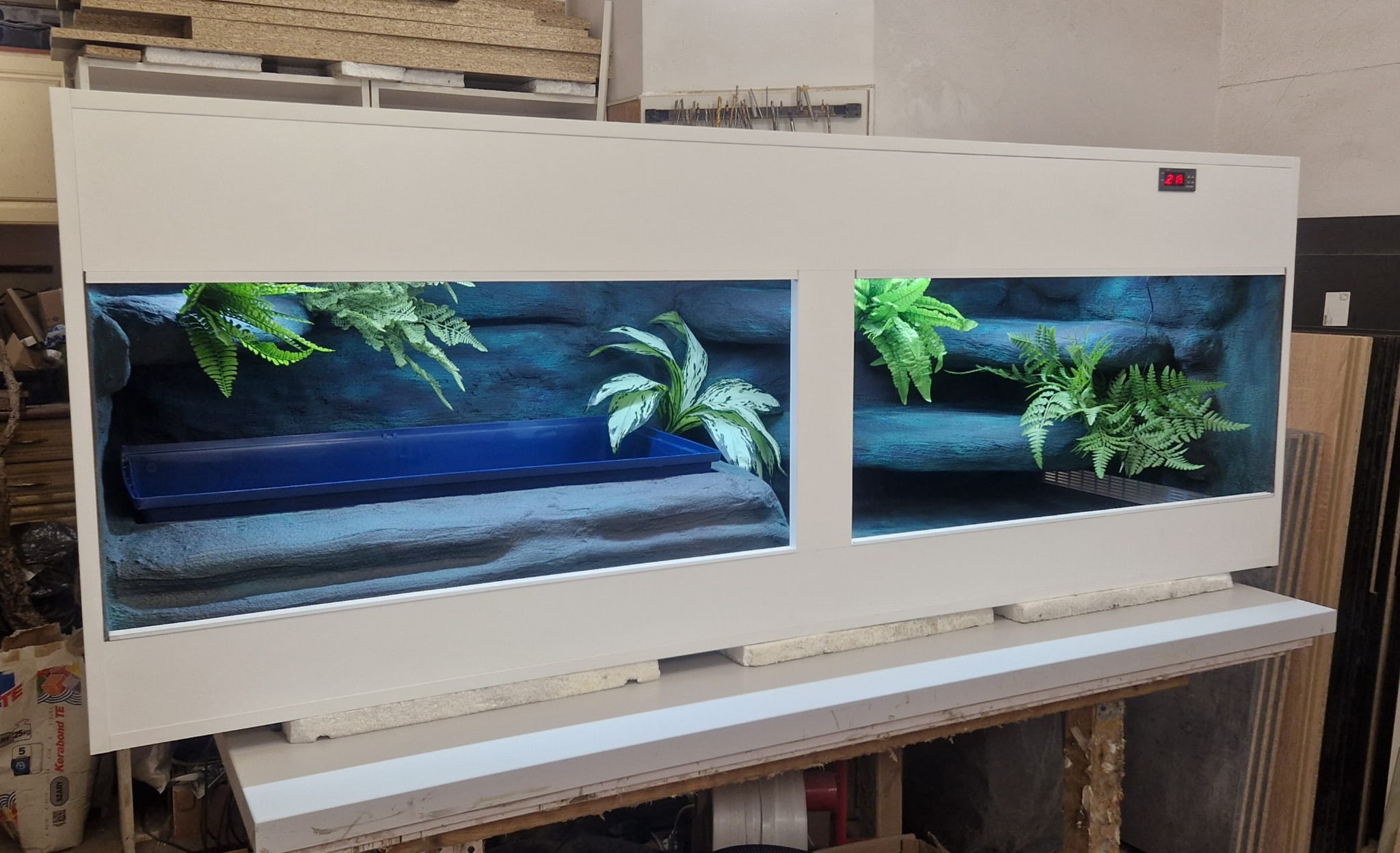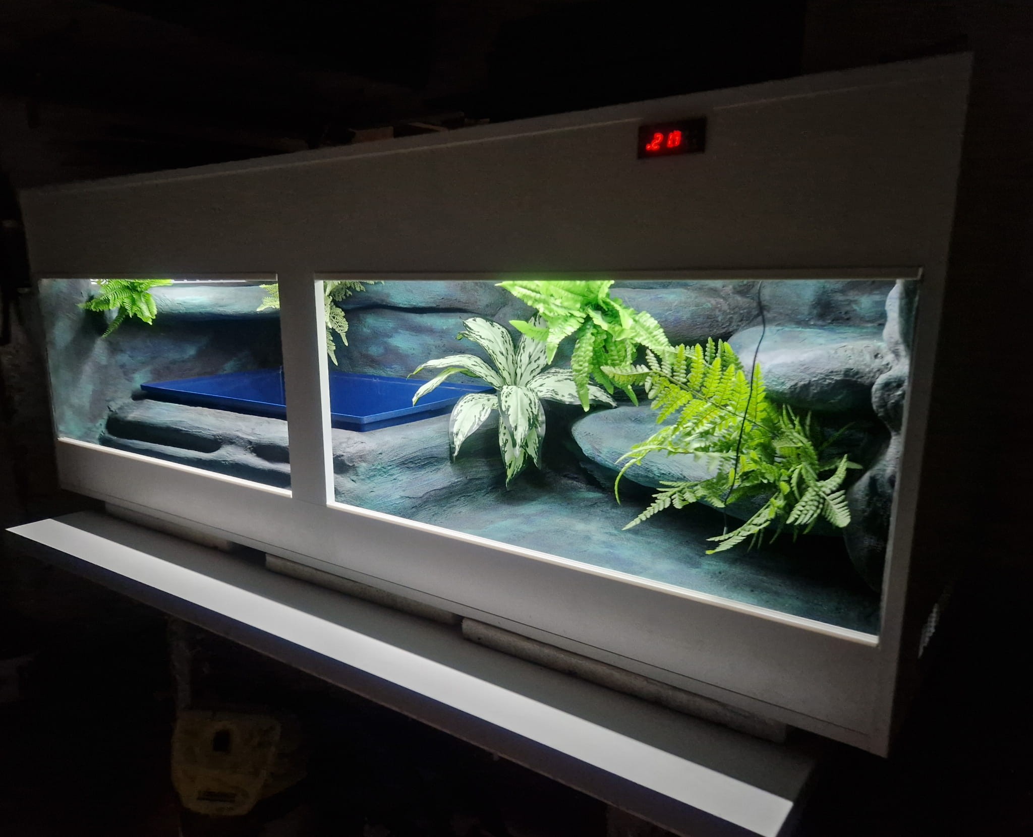 - sufit podwieszany, który zabiera nam 12 cm przestrzeni od góry zbiornika - dzięki niemu mamy maksymalnie ukrytą elektrykę co jest najbardziej bezpieczną opcją dla węży